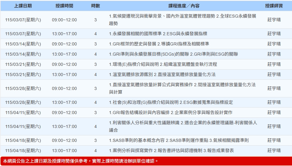 因應碳權交易與全球ESG趨勢,本課程旨在培養永續管理師及碳排管理師等高專業人才。課程設計將涵蓋最新的ESG標準和實務操作,幫助學員掌握應對未來職場挑戰的能力,並促進地區經濟的可持續發展。此外,課程也將強調跨領域知識整合,以滿足不同行業對於永續發展的需求。