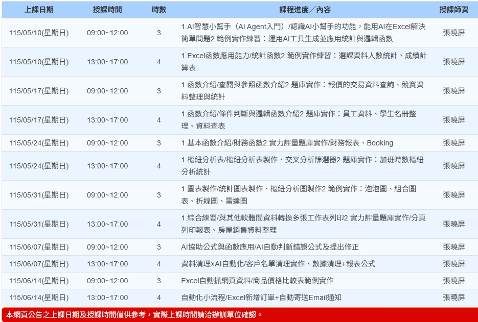 本課程內容包括「入門函數」、「進階函數」、「樞紐分析應用」、「進階圖表設定」等,在